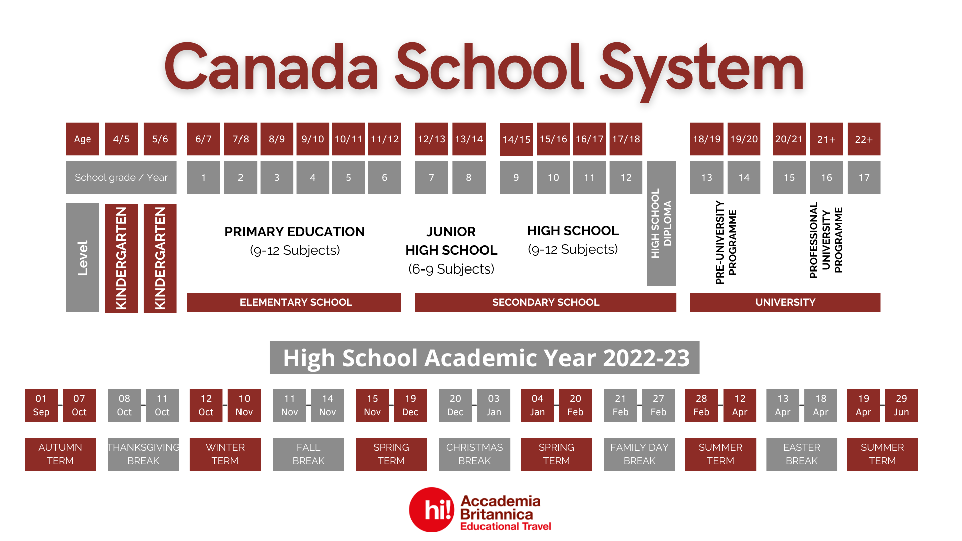 Il percorso scolastico si articola in 12 anni (grades) che coprono l’intero arco di studi di uno studente minorenne. Dal primo al sesto anno si frequenta la Elementary school, dal settimo al nono anno la Middle school e infine, dal decimo al dodicesimo anno, la Secondary school, corrispondente alla nostra scuola superiore. Le scuole superiori hanno sempre una durata inferiore rispetto a quella italiana, di cinque anni. Si passa quindi ai due anni di college per poi diplomarsi o continuare con altri tre anni di Università.